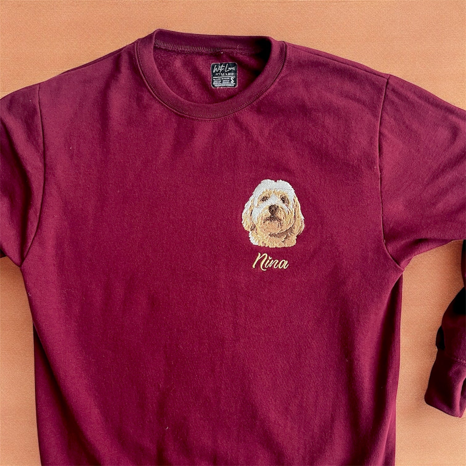 Sudadera de cuello redondo personalizada con el rostro de tu mascota con un bordado hecho a partir de su fotografía. Un recuerdo imborrable que une comodidad, estilo y emociones.